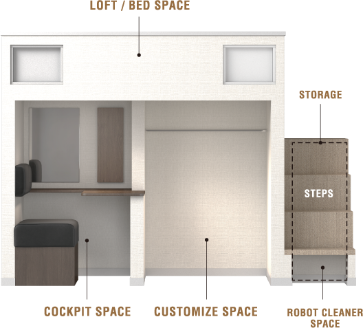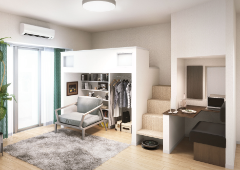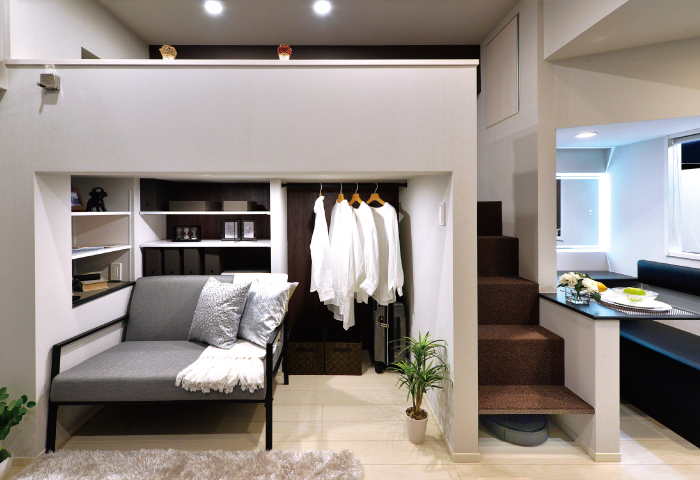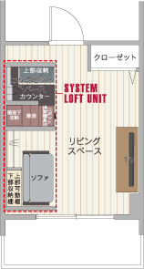 ロフト上をベッドスペースにし、下からは見えずらくなり、部屋全体にゆとりをもたらし、整理された空間へと変えます。
