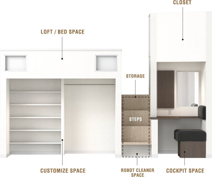 ロフト下は自由にカスタマイズできる空間。可動式棚やテーブル、ハンガーパイプなどライフスタイルに合わせて多目的に利用可能。