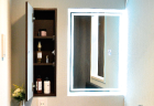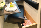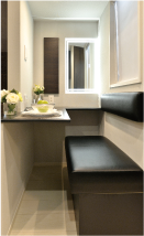 カウンターテーブル、備え付けの椅子(下部収納)を設け、ダイニングやワークスペースとして活躍します。照明付きビューティーミラー(埋込式)や小物入れも設し、パウダールームとしても利用できます。